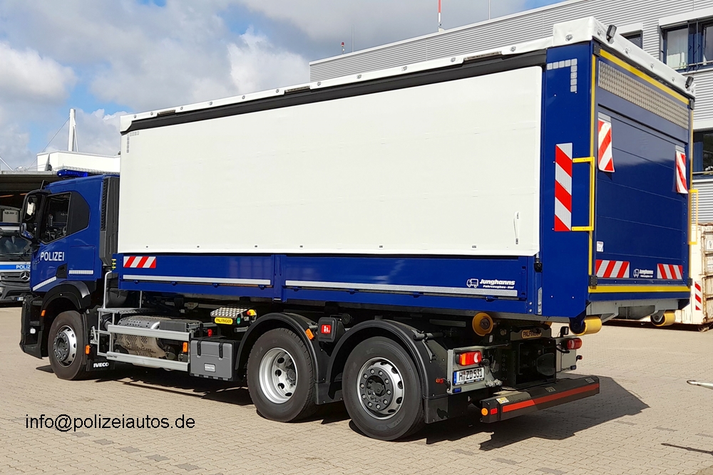 | Beschreibung: | Wechselladerfahrzeug der Bereitschaftspolizei Niedersachsen, hier mit einem austauschbaren Ladungsträger der Hamburger Polizei beladen. Fotos: I. Kröning |