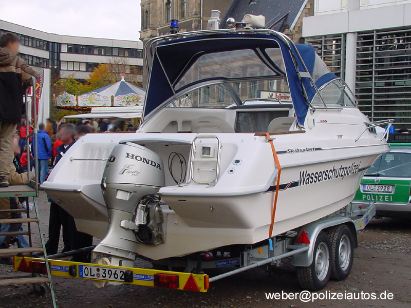 Beschreibung: | Boot 29 der Wasserschutzpolizei Niedersachsen Technische Daten Bootstyp: Streifenboot (trailerbar) Bauart: Gleiter, Knickspanter Herstellerbezeichnung: Skibsplast 655 Material GFK Baujahr: 2000 Bauwerft: Skibsplast (Norwegen) Länge/Breite/Tiefgang: 6,43m / 2,30m / 0,30m Sozialräume: 1 Kajütraum Hauptmotoren/Typ: 1 x Außenbordmotor Honda F 100 DETL Leistung: 73,55 kW / 100 PS Vh km/h: 32,4 kn / 60 km/h Kraftstoffvorrat: 150 L Trinkwasservorrat: 15 L Bordspannung: 12 V Echolot: VDO Ocean Line Kompass (Zahl und Art): 1 Silva 70 UN Kommunikationsanlagen: Polizeifunk 4m tragbar Einsatzgebiet: Steinhuder Meer Trailer: Massanek, Typ 2000, zum Transport eines Polizeibootes, passend zum Zugfahrzeug VW Passat Variant |