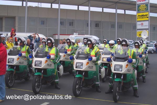 Die Polizeibegleitung (Rundfahrtpolizei) der ODDSET-Tour auf dem Weg in den Start- / Zielraum.