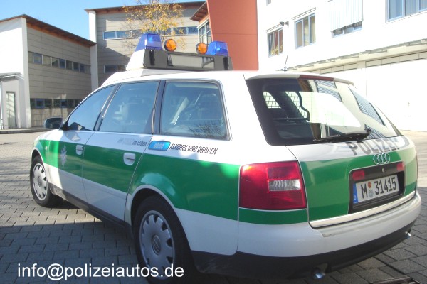 Funkstreifenwagen der Autobahnpolizei mit zusätzlichen Blinkleuchten auf dem Blaulichtbalken.