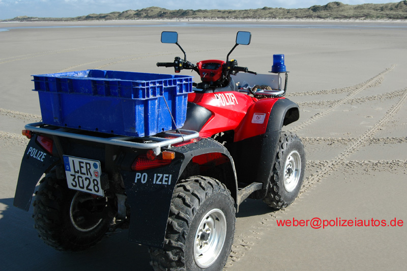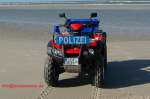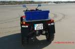 | Beschreibung: | "Streifenfahrzeug" der Polizei Niedersachsen auf der Nordseeinsel Borkum. Technische Daten: Motor: 1 Zyl.-4-Takt-Motor, wassergekühlt Hubraum: 675 ccm Leistung kW/PS 24,6 / 34 Gassteuerung 4 Ventile Vollautomatisches Getriebe, umschaltbar auf ESP 1 Rückwärtsgang zuschaltbarer Allrad + selbstsperrendes Frontdifferential Reifen vorn: 25 x 8 -12 Zoll Reifen hinten 25 x 10 -12 Zoll 2 x hydraulische Scheibenbremsen vorn 1 x hydraulische Scheibenbremse mit Dopppelkolbensattel hinten Radstand 1,29 m Spurweite 1,17m Zul. Gesamtgewicht 511 kg Anhängelast 385 kg Zulassung 1 Person Tankinhalt 17 l. Fotos: Klaus-Dieter Uhde |