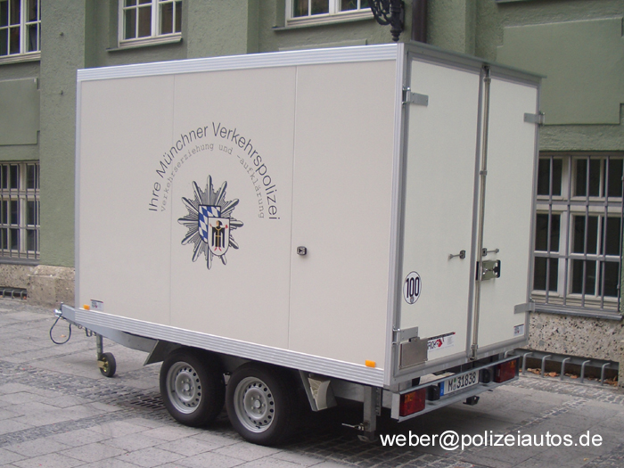 Anhänger der Münchner Verkehrspolizei, beladen mit Gerätschaften zur Verkehrsaufklärung und -erziehung