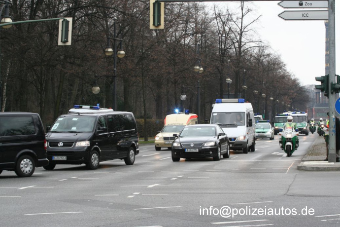 | Beschreibung: | ... folgen weitere Begleitfahrzeuge des Protokolls sowie zur Bewältigung möglicher Zwischenfälle, wozu unter anderem die medizinische Versorgung gehört, die in Berlin regelmäßig durch Personal und Fahrzeuge des Bundeswehrkrankenhauses Berlin sichergestellt wird (KTW auf Bild 2). Fotos: sj1 |