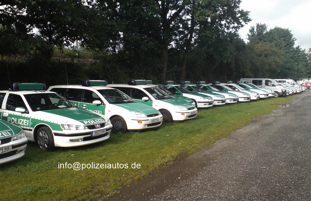 Ausgemusterte Ford Focus und Peugeot 406 der saarländischen Polizei warten auf ihre außerpolizeiliche Verwendung.