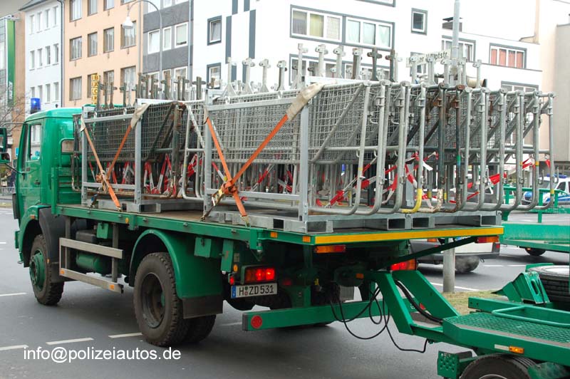 Vollbeladener Lkw der Polizei Niedersachsen zum Transport von Hamburger Gittern mit entsprechendem Anhänger.