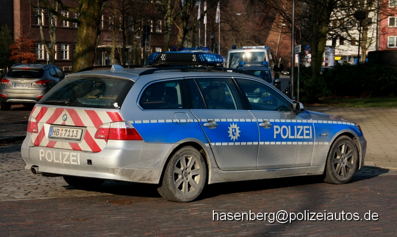 | Beschreibung: | BMW 520d. Funkstreifenwagen der Verkehrsbereitschaft (VB) Bremen mit einer rot/weißen Warnmarkierung am Heck.