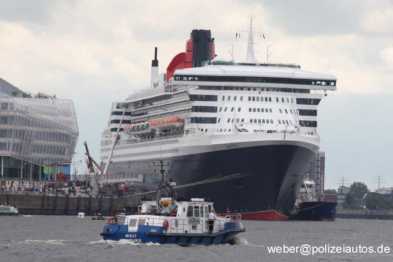 der Hamburger Wasserschutzpolizei Kurs auf einen großen Pott, auf die am Kreuzfahrtterminal liegende Queen Mary 2.
