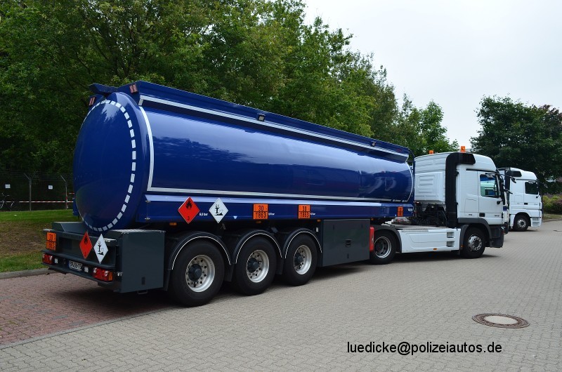 | Beschreibung: | Schwere Sattelzugmaschine mit Tankauflieger für die Fliegerstaffeln. Während die Zugmaschine vor der Einführung der einheitlichen Farbgebung beschafft wurde, erfolgte die farbliche Gestaltung des Tanksattelaufliegers bereits in Anlehnung an die Farbstudie Sonderfahrzeuge von Polizeiautos.de. |