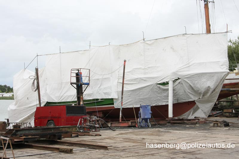 | Beschreibung: | Zollboot Bad Zwischenahn. (Typ: 18-Meter-Zollboot, Hersteller: Fassmer-Werft Baujahr: 1996) Die zweite Aufnahme zeigt es, mit viel Phantasie, verhüllt auf der Werft liegend, bei Sandstrahl- bzw. Lackierarbeiten. 1. Foto: Ingo Hoffmann |