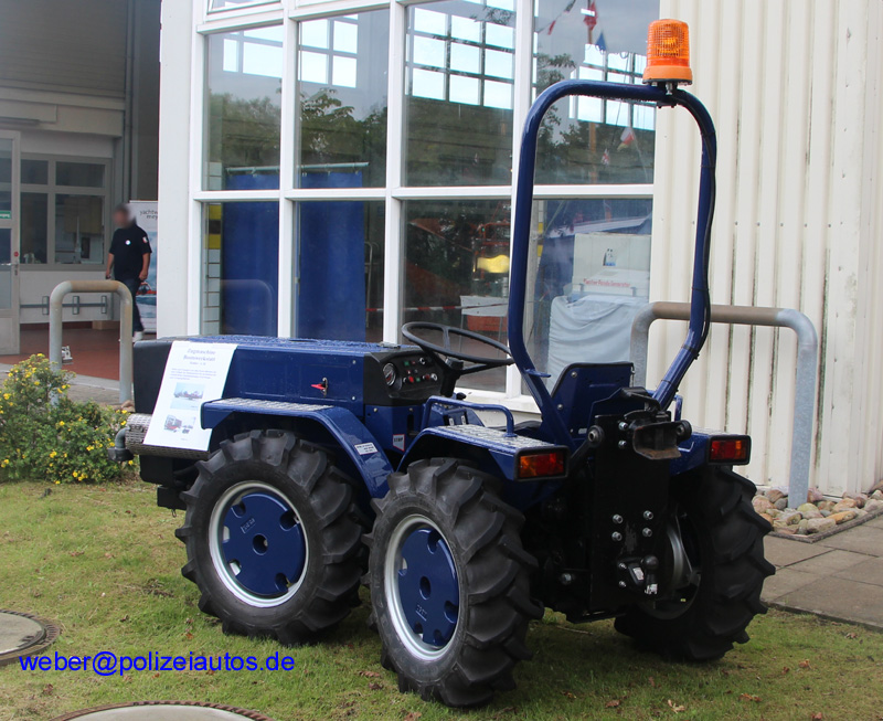 | Beschreibung: | Fahrzeug der Bootswerkstatt der Bundespolizei See in Neustadt i. H. Dieser Schlepper dient zum Transport von allen Kontrollbooten auf dem Gelände der Bundespolizei See im Rahmen der erforderlichen Instandsetzungen, Erprobungs- und Verlegungsfahrten. Technische Daten: Bezeichnung: Blockbauart mit Allradlenkung und Allradantrieb Motor: Lombardini Motori SpA, Italien Bezeichnung: 914 Arbeitsverfahren: Viertakt-Diesel mit Direkteinspritzung Zylinder: 2 Hubraum: 1.323 ccm Motordrehzahl: 3.000 U/min Leistung: 28 PS Kühlung: Wasserkühlung Getriebe: 2 Differentialgetriebe mit 6 Vorwärts- 3 Rückwärtsgängen Geschwindigkeit: 1,3 - 25 km/h Zapfwelle: 540 und 830 U/min Lenkung: Hydrostatische Lenkung Bremse: Fuß- und Handbremse: Simplex Trommelbremsen auf alle 4 Räder wirkend Differentialsperre: Für Vorder- und Hinterachse, mit einem Hebel einrückbar Hydraulik: 3-Punktaushebung Kat. I. Hubkraft 1.200 kp Länge: 2.850 mm Äußere Breite (schmal/breit): 950/1.150 mm Spurweite: 760/950 mm Höhe: 1.940 mm Radstand: 1.110 mm |