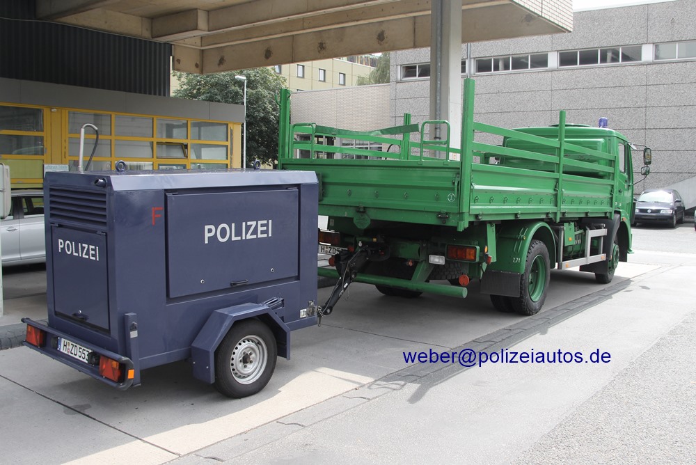 Transport-Lkw der niedersächsischen Bereitschaftspolizei (hier ohne Plane) mit angehängtem