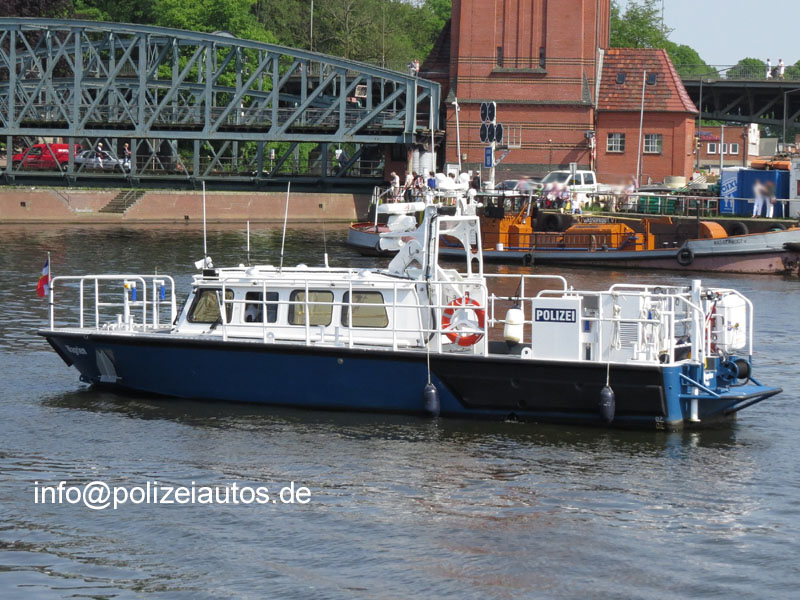 Beschreibung: | Streifenboot der Wasserschutzpolizei Schleswig-Holstein, WSP-Station Lübeck-Travemünde. Technische Daten Bauwerft: Marine Alutech OY AB, Teijo, Finnland Schiffstyp: Watercat 1100 P Länge:12 m Breite: 3,4 m Tiefgang: 1 m Verdrängung: 8 t Motorisierung:2 x Volvo Penta D4 mit je 191 kw / 260PS Das Streifenboot wird auf der Trave und dem Elbe-Lübeck-Kanal im Zuständigkeitsbereich der Wasserschutzpolizeistationen Lübeck und Mölln eingesetzt. Fotos: Olaf Schulz |