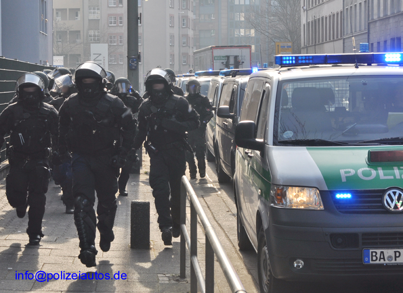 | Beschreibung: | Die Aufnahmen stammen von den Blockupy-Protesttagen im März 2015 in Frankfurt/Main. Der Wawe 10 der bayerischen Bereitschaftspolizei mit der Kennung BY 2 sperrt einen Straßenzug. Auf dem zweiten Foto stehen bayerische Grukw hintereinander aufgereiht, während Einsatzkräfte, u.a. aus Niedersachsen, vorbeilaufen. Fotos: Gottung |