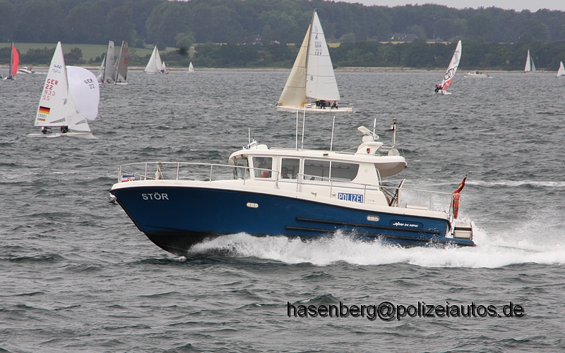 Bootstyp MINOR 34, Bauwerft Sarins Batar, Kokkola, Finnland. Deutscher Importeur Harle Yachtbau aus Esens, Niedersachsen. Technische Daten: Länge: 10,40m, Breite: 3,40m, Tiefgang: 1,10m, Geschwindigkeit: 30 kn Antrieb: Doppelmotorenanlage 2x 6 Zylinder Reihenmotoren mit je 272 kW und abgewinkelten ZF Getrieben und vierflügligen Bronzepropellern. Bau unter Aufsicht der Finnish Maritime Administration, Standard „work boat“. Rumpfzertifizierung durch den Germanischen Lloyd Bau- und Ausrüstungs- Sicherheitszeugnis durch die Seeberufsgenossenschaft Rumpfform mit gekimmten Steven und scharfen 1. V-Spant für gute Rauwassereigenschaften und schnelle Gleitfahrt. Sicheres umlaufendes Arbeitsdeck mit Schanzkleid. Gute Manövereigenschaften durch hydraulische Doppelruderanlage und automatische Trimmklappensteuerung. Moderne Navigations- und Funksicherheitseinrichtung mit: SIMRAD Blackboxradaranlage mit 17 Zoll TFT Monitor und Antikollisionsmodul SIMRAD Differential GPS Navigator mit C-Map Seekartensystem, Wegpunkten- und Routenprogrammierung. Automatic Information System (AIS), Navtexreceiver für nautische Warnmeldungen, Navigationsecholotanlage und Dopplerlog SAILOR UKW- Seefunkanlage, Satellitennotfunkbarke, Radartransponder, Handsprechfunkgeräte sowie Polizeifunkanlage Heimathafen: WSPR Kiel Auf den Bildern ist das Boot bei der Kieler Woche 2016 in der dortigen Kieler Bucht im Einsatz. Foto 4: Ingo Hoffmann |