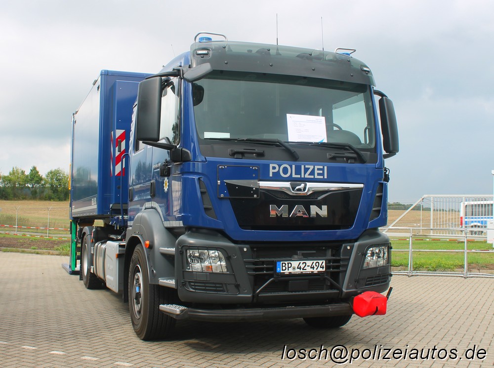 Bei diesem von der Firma Empl ausgebauten Fahrzeug handelt es sich um das 2021 in Dienst gestellte Musterfahrzeug dieser neuen Fahrzeuggeneration. Gegenüber den Vorgängermodellen Mercedes 1017 mit fest montiertem Gerätekoffer verfügen diese neuen Fahrzeuge über jeweils 2 austauschbare Ladungsträger (ATL), die mittels Rollwagen unterschiedlich beladen werden können, abhängig vom Einsatzanlass bzw. den Aufgaben der jeweiligen technischen Einsatzeinheit. Zur Verfügung steht ein geschlossener Kofferaufbau mit heckseitigem Vertikallift sowie ein Kofferaufbau mit seitlichen Gerätefächern und heckseitigem Vertikallift. Zudem verfügt das Fahrzeug über eine Seilwinde, Rotzler Treibmatic (Zugkraft vorne 10t, Zugkraft hinten 20t). Weiterhin besitzt dieses Fahrzeug (wie nur einige Modelle der späteren Serie) eine ADR-Zulassung für den Transport gefährlicher Güter (z.B. Kraftstoffkanister). |