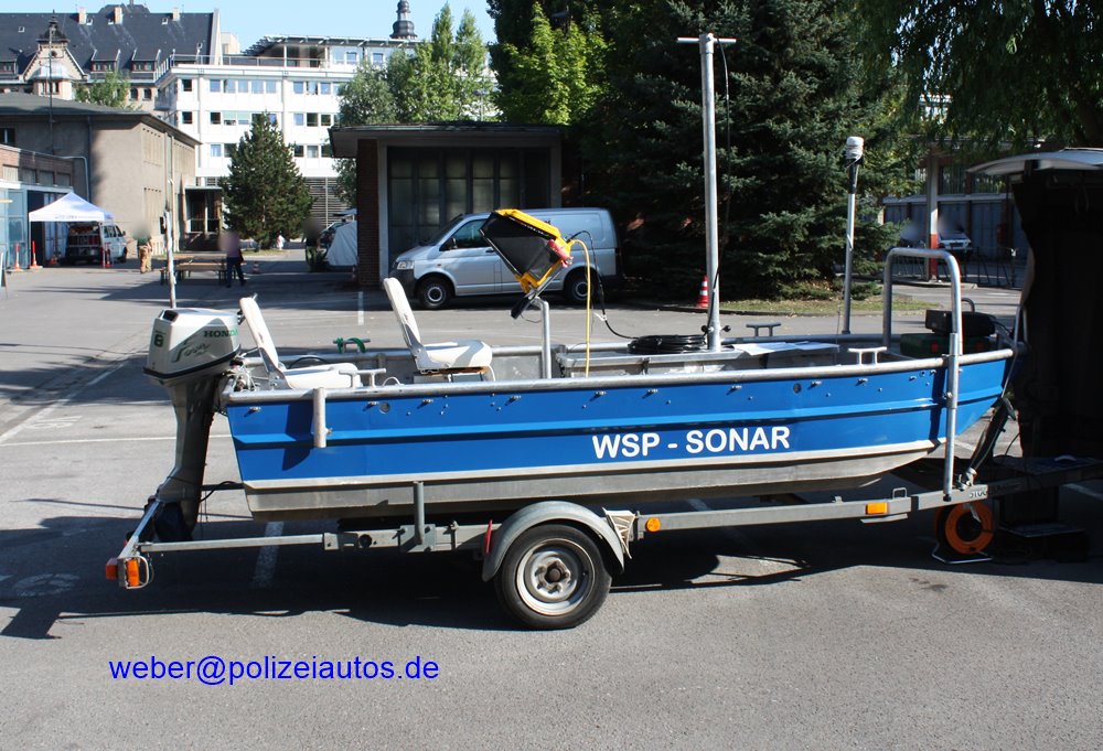 | Beschreibung: | Trailerbares Polizeistreifenboot "Sonar" der Wasserschutzpolizei Niedersachsen. Technische Daten Bootstyp: Streifenboot-Sonarträger Bauart: Aluminium Arbeitsboot AL.SEB 400 Baujahr: 2000 Bauwerft: Josef Reich GmbH, Petersaurach Länge ü.A.in m: 4,00m Breite in m: 1,55m Motoren: 1 x Außenbordmotor Honda BF 8 LGD Leistung: 5,9 kw/8 PS Foto 4: Berthold Mund |