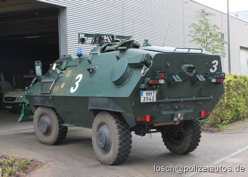 | Beschreibung: | Sonderwagen SW 4 mit Räumschild an der Fahrzeugfront. Bei diesem aus dem Bestand der Bundespolizei stammenden Fahrzeug wurden Ende 2014 die bisherigen Blaulichter durch LED-Kennleuchten ersetzt. Ebenso wurde die Lichtleiste mit LED-Leuchten ausgestattet sowie am Heck eine Rückfahrkamera montiert. |