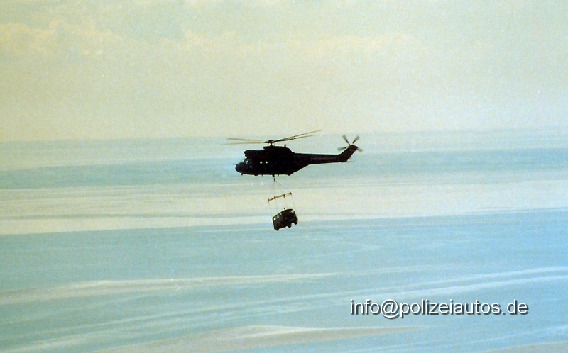 Mit der Hilfe eines Hubschraubers vom Typ Hubschrauber Aerospatiale SA 330 Puma, der Bundesgrenzschutzfliegerstaffel Fuhlendorf, wird eine Gruppe von Beamten von Bredstedt nach Sylt verlegt. Ihr Halbgruppenkraftwagen wird dabei als Außenlast am Hubschrauber hängend mitgeführt. Das ersten Bild zeigt den Abflug in Bredstedt, dass zweite die Landung auf der Insel Sylt. Bild 3 zeigt den Transport über der Nordsee. Foto und Info: Frank Reichow |