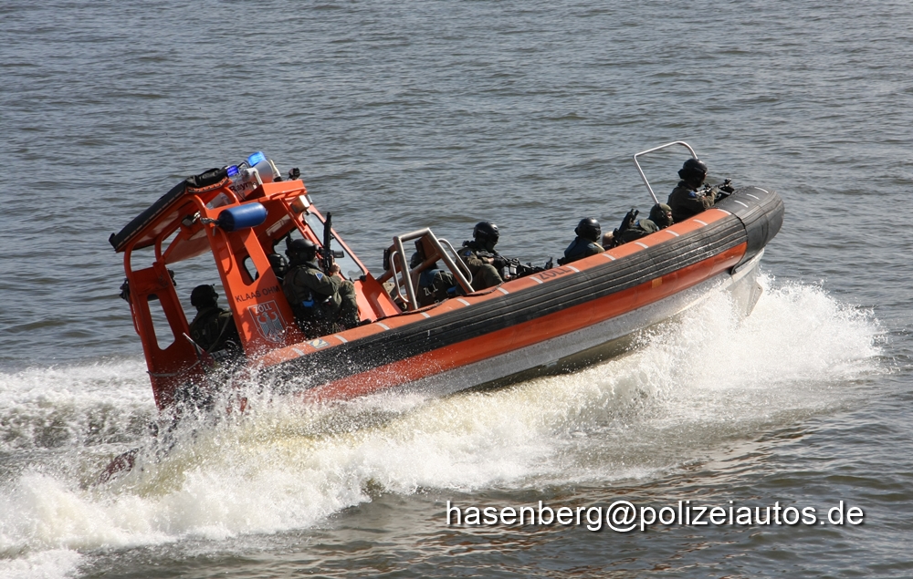 Die Klaas Ohm wird auf dem Zollkreuzer Helgoland als Kontrollboot mitgeführt. Aus dem zweiten Bild hängt sie am Schiffsdavid der Helgoland. Das Boot hat eine Länge von 8,50m und erreicht eine Geschwindigkeit bis zu 40 Knoten (ca. 74 km/h). Aufgenommen wurden die Bilder, bei einer Vorführung der ZUZ, anlässlich des Tag des Zoll 2017 in Hamburg. |