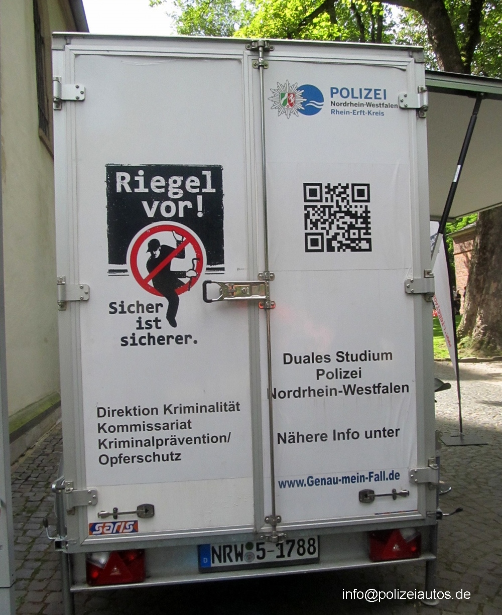 | Beschreibung: | Anhänger für die Öffentlichkeitsarbeit der Polizei Nordrhein-Westfalen, hier speziell zur Verhinderung von Einbrüchen, nach dem Motto: Riegel vor ! Fotos: Manfred Wilewka |