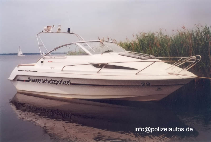 Beschreibung: | Boot 29 der Wasserschutzpolizei Niedersachsen Technische Daten Bootstyp: Streifenboot (trailerbar) Bauart: Gleiter, Knickspanter Herstellerbezeichnung: Skibsplast 655 Material GFK Baujahr: 2000 Bauwerft: Skibsplast (Norwegen) Länge/Breite/Tiefgang: 6,43m / 2,30m / 0,30m Sozialräume: 1 Kajütraum Hauptmotoren/Typ: 1 x Außenbordmotor Honda F 100 DETL Leistung: 73,55 kW / 100 PS Vh km/h: 32,4 kn / 60 km/h Kraftstoffvorrat: 150 L Trinkwasservorrat: 15 L Bordspannung: 12 V Echolot: VDO Ocean Line Kompass (Zahl und Art): 1 Silva 70 UN Kommunikationsanlagen: Polizeifunk 4m tragbar Einsatzgebiet: Steinhuder Meer Trailer: Massanek, Typ 2000, zum Transport eines Polizeibootes, passend zum Zugfahrzeug VW Passat Variant |