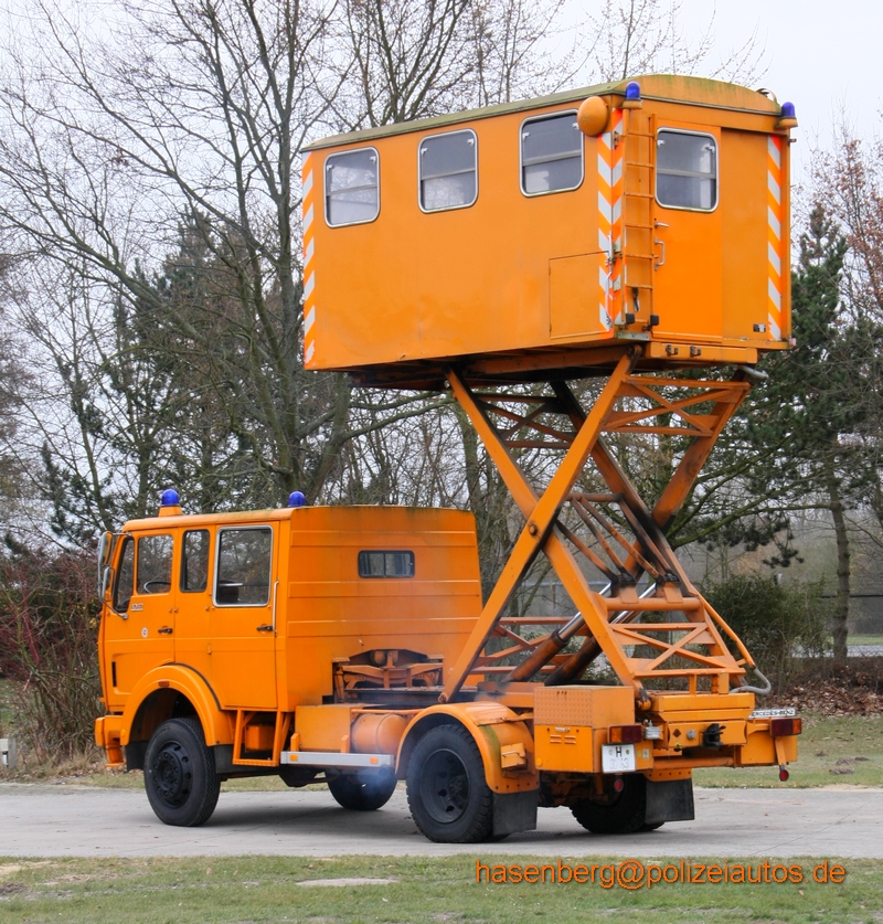 Bei diesem Fahrzeug handelt es sich um einen Prototyp der nach den schweren Demonstrationen in Grohnde und Gorleben von der niedersächsischen Landespolizei beschafft wurde. Die Beobachtungskabine kann stufenlos über eine Hydraulik auf eine Höhe von 4,2m angehoben werden. Dieses Fahrzeug sollte bei Kundgebungen und Großveranstaltungen einen Überblick über große Menschenansammlungen ermöglichen. Da sich das Konzept nicht durchsetzten konnte blieb es bei diesem Einzelstück, welches bei der Fa. Schörling in Hannover gebaut wurde. Mittlerweile wird das Fahrzeug bei der Hubschrauberstaffel als mobiler Tower genutzt. |