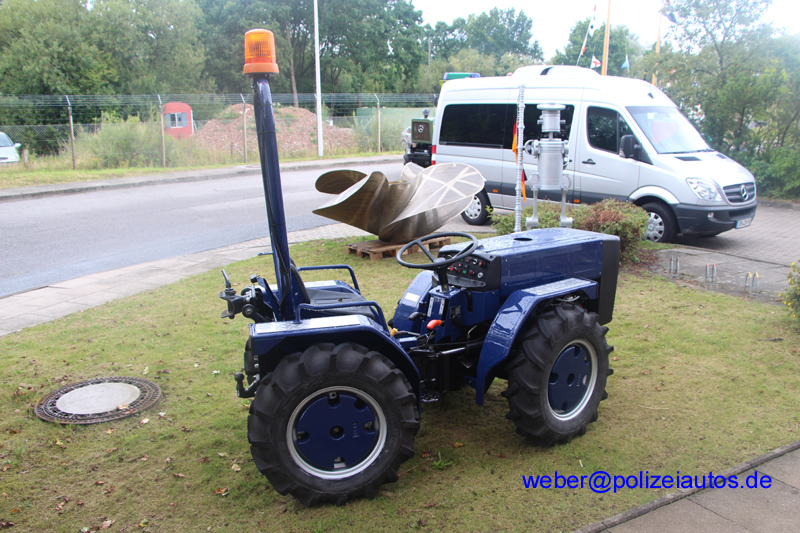 | Beschreibung: | Fahrzeug der Bootswerkstatt der Bundespolizei See in Neustadt i. H. Dieser Schlepper dient zum Transport von allen Kontrollbooten auf dem Gelände der Bundespolizei See im Rahmen der erforderlichen Instandsetzungen, Erprobungs- und Verlegungsfahrten. Technische Daten: Bezeichnung: Blockbauart mit Allradlenkung und Allradantrieb Motor: Lombardini Motori SpA, Italien Bezeichnung: 914 Arbeitsverfahren: Viertakt-Diesel mit Direkteinspritzung Zylinder: 2 Hubraum: 1.323 ccm Motordrehzahl: 3.000 U/min Leistung: 28 PS Kühlung: Wasserkühlung Getriebe: 2 Differentialgetriebe mit 6 Vorwärts- 3 Rückwärtsgängen Geschwindigkeit: 1,3 - 25 km/h Zapfwelle: 540 und 830 U/min Lenkung: Hydrostatische Lenkung Bremse: Fuß- und Handbremse: Simplex Trommelbremsen auf alle 4 Räder wirkend Differentialsperre: Für Vorder- und Hinterachse, mit einem Hebel einrückbar Hydraulik: 3-Punktaushebung Kat. I. Hubkraft 1.200 kp Länge: 2.850 mm Äußere Breite (schmal/breit): 950/1.150 mm Spurweite: 760/950 mm Höhe: 1.940 mm Radstand: 1.110 mm |