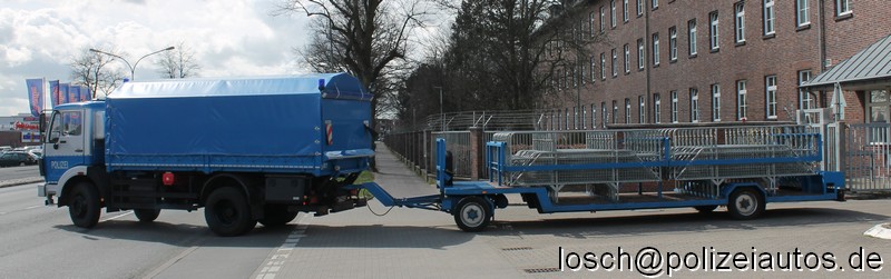 | Beschreibung: | Anhänger der Polizei Mecklenburg-Vorpommern zum Transport von "Hamburger" Gittern. Der ehemals grün lackierte Anhänger wurde inzwischen an das aktuelle Farbschema der Polizei Mecklenburg-Vorpommern angepasst. Im Einsatz wird der Anhänger von einem ebenfalls umlackierten Mercedes-Benz 1017 gezogen. |