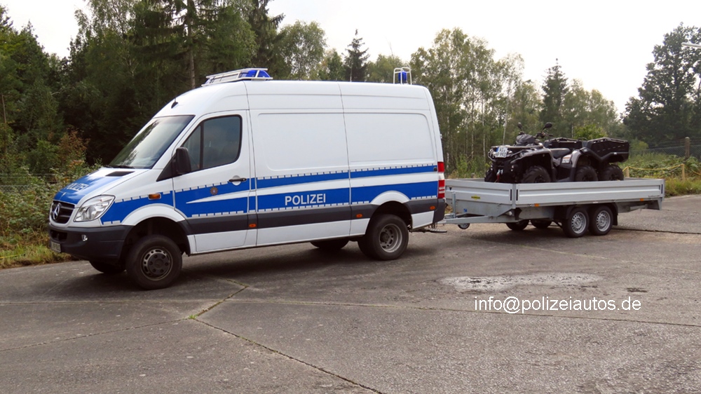 | Beschreibung: | Bundeseinheitlicher Halbgruppengerätekraftwagen (HGGkW) der Bereitschaftspolizei Hessen, hier mit Anhänger und darauf verladenem ATV Outlander 1000 Max der TEE. Fotos: Dönges |