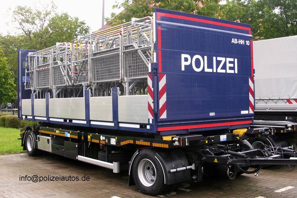| Beschreibung: | 2-achsiger Anhänger für austauschbare Ladungsträger (ATL) der Polizei Hamburg, hier beladen mit dem Aufbau HH10, für den Transport von Hamburger Gittern.