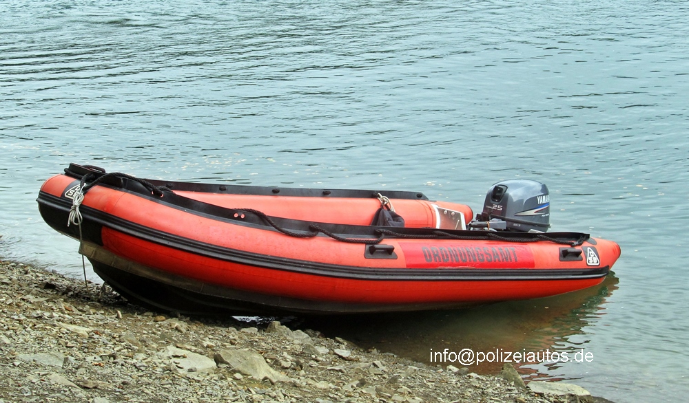 Schlauchboot des Ordnungsamtes Gummersbach, hier am Ufer der Aggertalsperre.