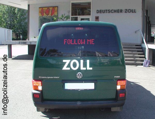 | Beschreibung: | ... international: Anhaltedisplay in englischer Sprache -FOLLOW ME- und Transportboxen für Diensthunde bei einem VW T4 des Grenzzolldienstes am Zollamt Weil am Rhein-Friedlingen |