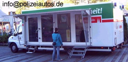 | Beschreibung: | -Sicherheitsmobil- mit zwei Büroarbeitsplätzen als Anlaufstelle für Bürger bei Großeinsätzen. Das gemeinsam von Stadt und Polizei betriebene Fahrzeug ist hier mit POLIZEI-Schriftzug zu sehen. |