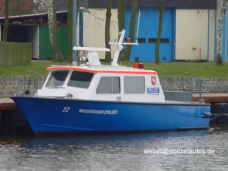 | Beschreibung: | Boot 22 der Wasserschutzpolizei im Hafen Vorsfelde. Inwischen wurde es in Nr. 16 umgekennzeichnet, leicht am Bugaufbau verändert (der Schutzbügel wurde gegen einen Einzelstab ausgetauscht) und nach Emden umstationiert. |