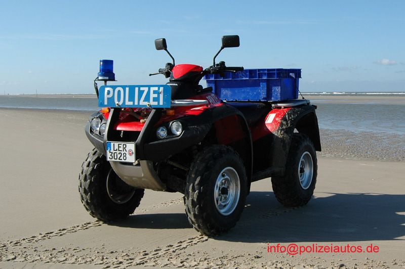 | Beschreibung: | "Streifenfahrzeug" der Polizei Niedersachsen auf der Nordseeinsel Borkum. Technische Daten: Motor: 1 Zyl.-4-Takt-Motor, wassergekühlt Hubraum: 675 ccm Leistung kW/PS 24,6 / 34 Gassteuerung 4 Ventile Vollautomatisches Getriebe, umschaltbar auf ESP 1 Rückwärtsgang zuschaltbarer Allrad + selbstsperrendes Frontdifferential Reifen vorn: 25 x 8 -12 Zoll Reifen hinten 25 x 10 -12 Zoll 2 x hydraulische Scheibenbremsen vorn 1 x hydraulische Scheibenbremse mit Dopppelkolbensattel hinten Radstand 1,29 m Spurweite 1,17m Zul. Gesamtgewicht 511 kg Anhängelast 385 kg Zulassung 1 Person Tankinhalt 17 l. Fotos: Klaus-Dieter Uhde |