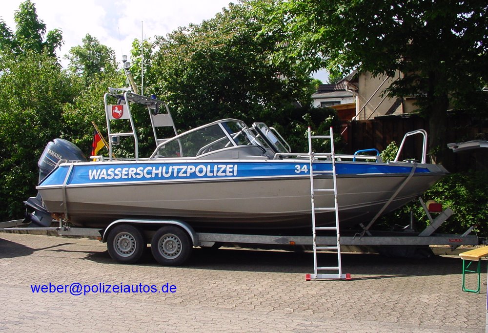 | Beschreibung: | Trailerbares Polizeistreifenboot W34 der WSP Niedersachsen, Heimathafen Nienburg. Technische Daten zum Boot: Bootstyp: Streifenboot (trailerbar) Bauart: Gleiter – Knickspantbauweise Baustoff Bootskörper: Marinealuminium Aufbauten: Cabrio Verdeck Baujahr: 2003 Bauwerft: FISKARS (Finnland) Länge ü.alles (m): 6,70 Länge Wasserlinie (m): 5,65 Breite ü.alles (m): 2,40 Breite Wasserlinie (m): 1,83 Gewicht Kg: 880 (ohne Zuladung und Motor) Tiefgang (m): 0,36 Verdrängung in t.: 0,88 Personen/Tragfähigkeit (Kg): 8/600 Kraftstofftank: 170 l Antrieb: Motortyp: Außenbordmotor Yamaha, F 225 AETX, 6 Zylinder kW/PS: 165 Kw/225 PS bei 5000UpM Antriebsart: Viertakt Einspritzer (Ottokraftstoff) Motorgewicht: 272 kg Höchstgeschwindigkeit: 50kn/ 90km/h. Ausrüstung: Echolot (Lowrance x125), GPS (Furuno GP-32), Polizeifunk (2m u. 4m), Schiffsfunk (UKW und Seefunkdienst) elektrische- u. Handlenzpumpe, Eberspächer Standheizung, Feuerlöscher, Digitaler Drehzahlmesser (u. a. mit Trimmanzeige, Betriebsstundenzähler), digitaler Geschwindigkeitsmesser (u.a. mit Kraftstoffanzeiger), Landanschluß, Kommandoanlage, Geräteträger (Scheinwerfer, Blaulicht, Lautsprecher, Funkantennen u.a.) Einsatzgebiet: Mittelweser, Aller, Hamme, Dümmer See. Sondereinsätze erfolgten bereits auf der Nord- und Ostsee. |
