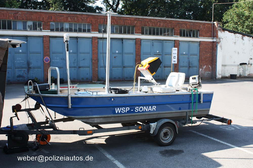 | Beschreibung: | Trailerbares Polizeistreifenboot "Sonar" der Wasserschutzpolizei Niedersachsen. Technische Daten Bootstyp: Streifenboot-Sonarträger Bauart: Aluminium Arbeitsboot AL.SEB 400 Baujahr: 2000 Bauwerft: Josef Reich GmbH, Petersaurach Länge ü.A.in m: 4,00m Breite in m: 1,55m Motoren: 1 x Außenbordmotor Honda BF 8 LGD Leistung: 5,9 kw/8 PS Foto 4: Berthold Mund |