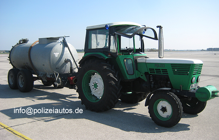 | Beschreibung: | Traktor mit Wasserwagen, eingesetzt beim Fahrsicherheitstraining. Kurios: Der Traktor besitzt runde Blaulichter eines ehemaligen Krades. Foto: Michael Dienst |