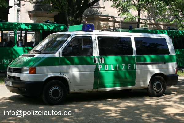 Halbgruppenkraftwagen der BePo Sachsen-Anhalt mit langem Radstand, zwei seitlichen Schiebetüren und getönten Scheiben.