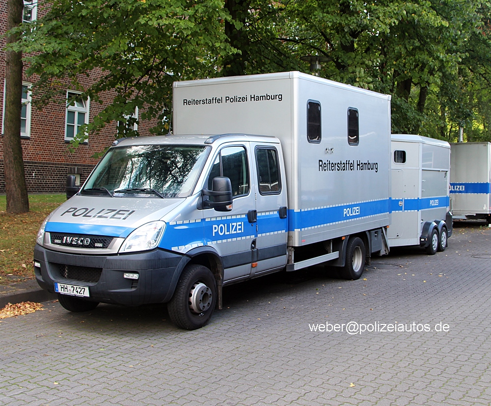 Beschreibung: | Pferdetransporter der Hamburger Reiterstaffel. Bei Bedarf können auf das Dach der Fahrerkabine zwei Magnetblaulichter aufgesezt werden. Technische Daten Leistung: 125kW/ 170 PS zul. Gesamtgewicht: 6,5 t, Platz für 6 Beamte und 2 Pferde. Foto 3: Michael Hinz Foto 4: I. Kröning |