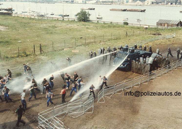 | Beschreibung: | Im Jahre 1982 wurden zwei niedersächsische WaWe 4000 der Bereitschaftspolizei Hannover dunkelblau lackiert und nach England verschifft, um den dortigen Kollegen in Greenwich den taktischen und praktischen Umgang mit einem eigenen Wasserwerfer näher zu bringen. Die Aufnahmen zeigen die Wasserwerfer während der Übungshandlungen nahe der Themse. |
