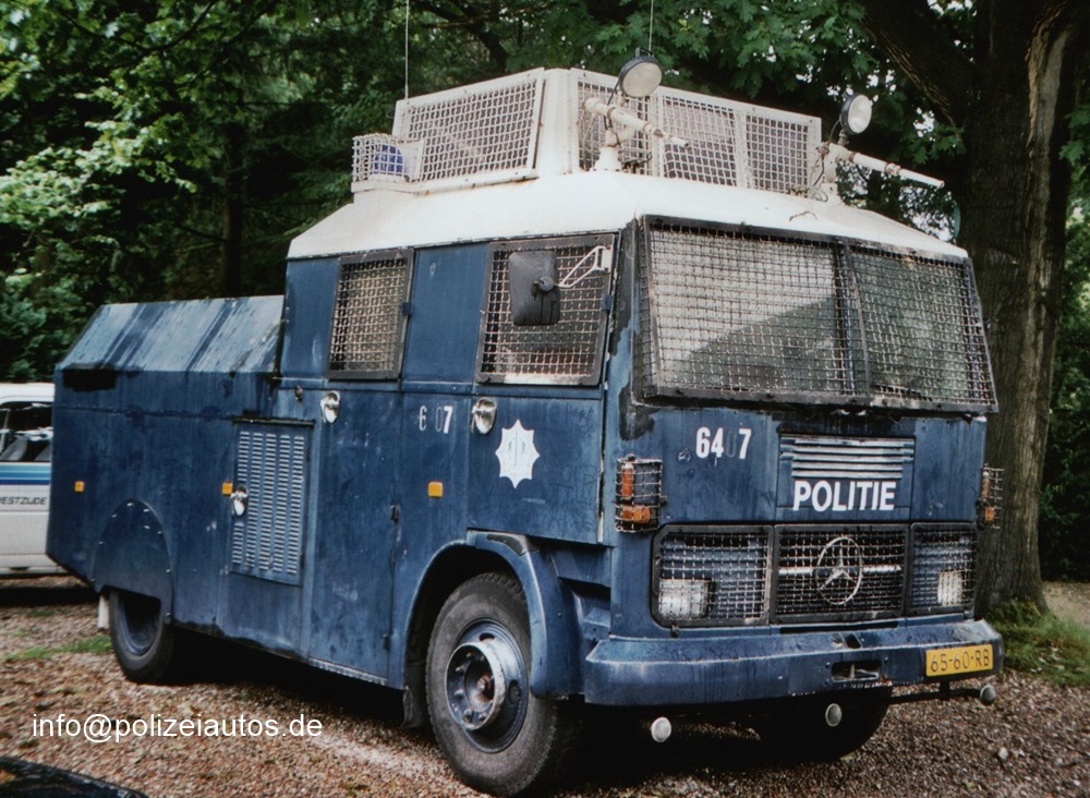 | Beschreibung: | Wasserwerfer 4500 der niederl. Politie. Aufbau: Saval-Kronenburg BV in NL-Hedel 6 Zylinder, 130 PS Pumpenmotor von VW mit 41 PS Baujahr: 1976, wurde von 1976 bis 1992 in den NL eingesetzt Länge : 6,25 m, Breite: 2,40 m, Höhe: 3,28 m Gewicht: 14 t Wassertankinhalt: 4500 l 3 Wasserkanonen auf der Kabine. Das Fahrzeug befindet sich im Polizeimuseum der NL in Apeldoorn. |