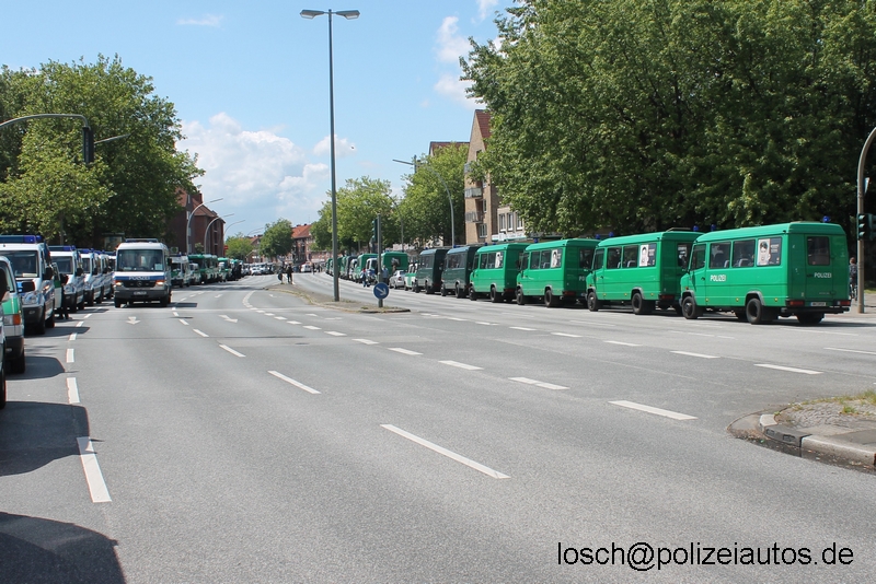 Polizeifahrzeuge mehrerer Bundesländer im Bereitstellungsraum anlässlich einer Demonstration in Hamburg-Wandsbek
