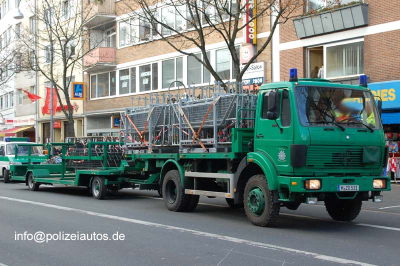 Vollbeladener Lkw der Polizei Niedersachsen zum Transport von Hamburger Gittern mit entsprechendem Anhänger.