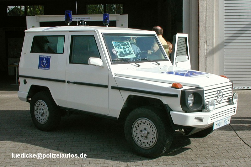 | Beschreibung: | Gepanzerter Sonderwagen (SW 3) auf Basis des Mercedes 280 GE für deutsche Polizeibeamte im WEU-Einsatz in Mostar (Bosnien & Herzegowina). Das Fahrzeug stammt vom Bundesgrenzschutz und wurde für den Auslandseinsatz weiß lackiert |