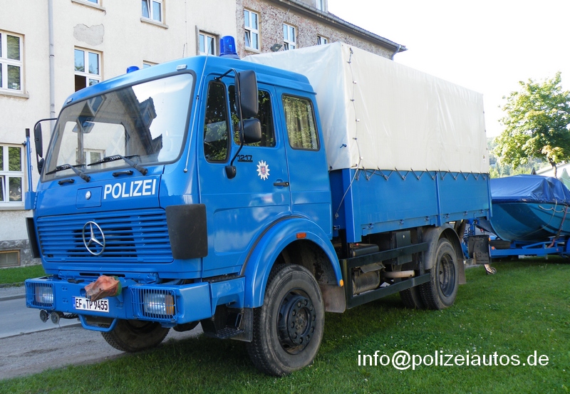 Lastkraftwagen (LKW) der Bereitschaftspolizei Thüringen mit Ladebordwand und POLIZEI-Schriftzug an der Front.