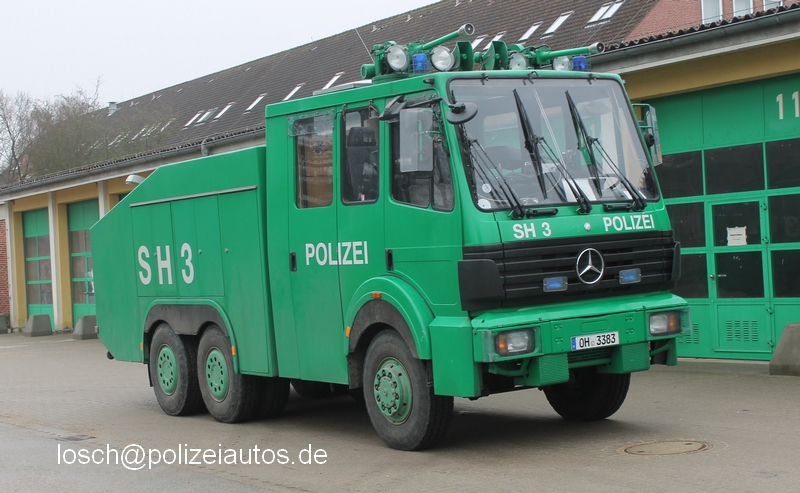 | Beschreibung: | Wasserwerfer 9000 der Bereitschaftspolizei Schleswig-Holstein, ehemals im Bestand der Bereitschaftspolizei Sachsen. Der Wawe verfügt an den Werfertürmen über geänderte Mundstücke. Diese sind manuell von Voll- auf Sprühstahl verstellbar und ermöglichen so z.B. das Ablöschen von Flächen- und Barikadenbränden. Im Rahmen von Instandsetzungsarbeiten wurde bei diesem Fahrzeug ein SK-Kühlergrill verbaut, der dem Fahrzeug ein einzigartiges Design verleiht. |