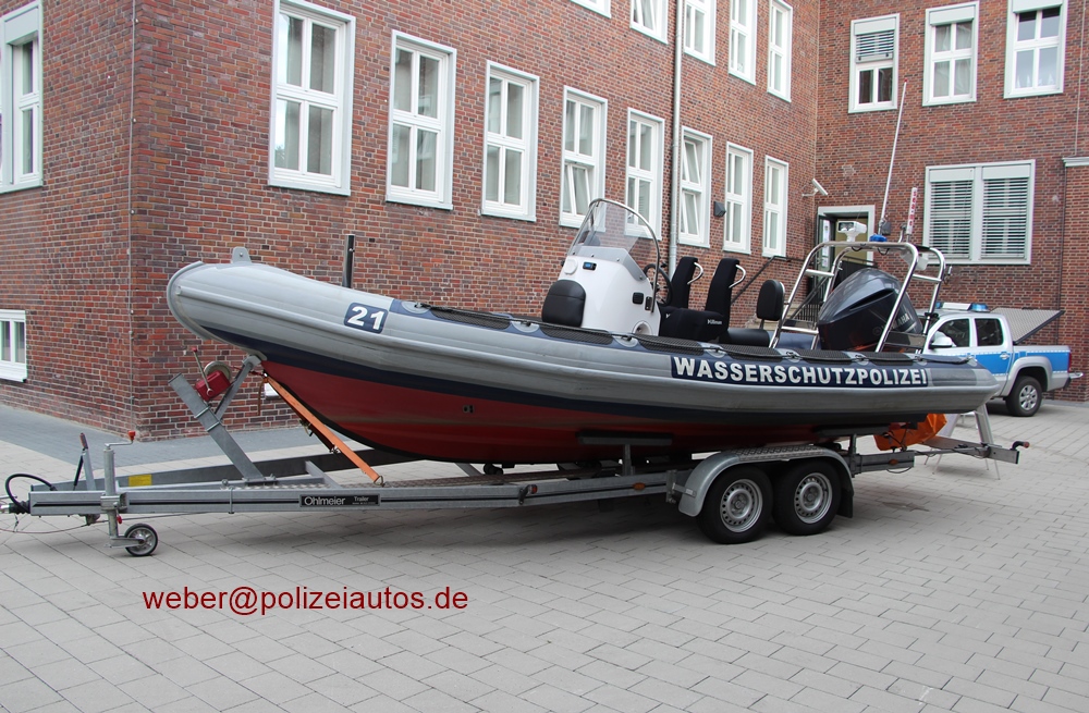 | Beschreibung: | Trailerbares Polizeistreifenboot 21 der WSP Niedersachsen, Heimathafen: Stade. Bauart: Festrumpfschlauchboot Typ: Ribcraft KM RC 6.80 Baujahr: 2012 Länge ü.A.: 6,80m Breite: 2,55m Tiefgang: 1,00m / 0,60m Leergewicht: 1360 kg Antrieb: Außenborder YAMAHA F225 FE TX EF1 Ultra Langschaft kw/PS je Motor: 165 kw/225 PS Höchstgeschwindigkeit sm/h km/h: 47 kn / ca. 87 km/h Dauergeschwindigkeit sm/h km/h: 25 kn / ca. 46 km/h Kraftstoffvorrat: 180 Liter, Niro Tank im Doppelboden. |