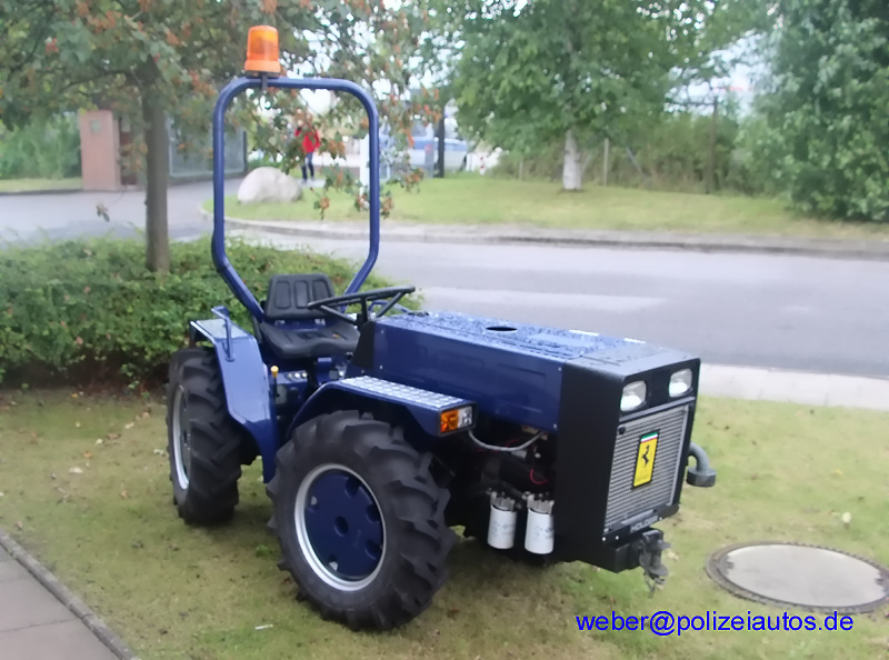 | Beschreibung: | Fahrzeug der Bootswerkstatt der Bundespolizei See in Neustadt i. H. Dieser Schlepper dient zum Transport von allen Kontrollbooten auf dem Gelände der Bundespolizei See im Rahmen der erforderlichen Instandsetzungen, Erprobungs- und Verlegungsfahrten. Technische Daten: Bezeichnung: Blockbauart mit Allradlenkung und Allradantrieb Motor: Lombardini Motori SpA, Italien Bezeichnung: 914 Arbeitsverfahren: Viertakt-Diesel mit Direkteinspritzung Zylinder: 2 Hubraum: 1.323 ccm Motordrehzahl: 3.000 U/min Leistung: 28 PS Kühlung: Wasserkühlung Getriebe: 2 Differentialgetriebe mit 6 Vorwärts- 3 Rückwärtsgängen Geschwindigkeit: 1,3 - 25 km/h Zapfwelle: 540 und 830 U/min Lenkung: Hydrostatische Lenkung Bremse: Fuß- und Handbremse: Simplex Trommelbremsen auf alle 4 Räder wirkend Differentialsperre: Für Vorder- und Hinterachse, mit einem Hebel einrückbar Hydraulik: 3-Punktaushebung Kat. I. Hubkraft 1.200 kp Länge: 2.850 mm Äußere Breite (schmal/breit): 950/1.150 mm Spurweite: 760/950 mm Höhe: 1.940 mm Radstand: 1.110 mm |