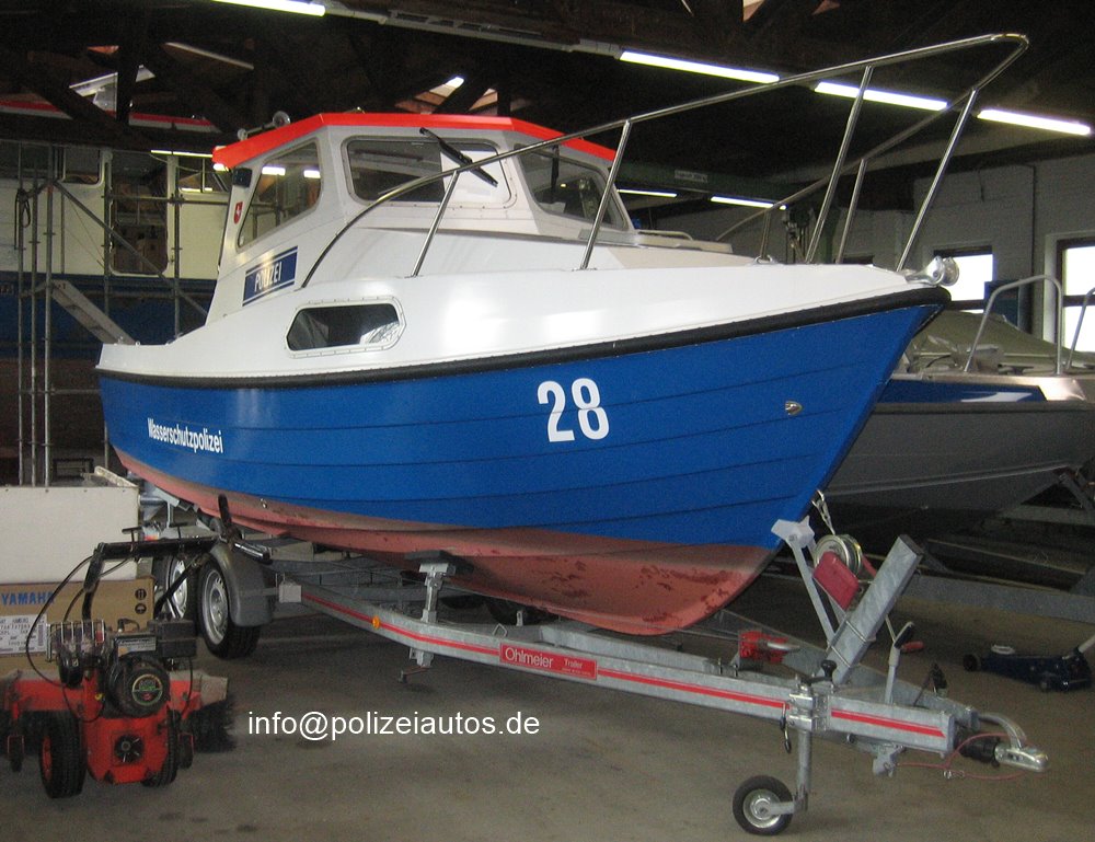 | Beschreibung: | Boot 28 der Wasserschutzpolizei Niedersachsen. Technische Daten: Bootstyp: Streifenboot (trailerbar) Bauart: Gleiter - Knickspantbauweise, Orkney Orkadian 23 Material des Bootskörpers: GFK Aufbauten: GFK Baujahr: 1993 Bauwerft: Orkney Boats, Großbritannien Länge ü.A. in m: 7,70 Breite in m: 2,50 Tiefgang in m: 0,40 (Rumpf) 0,70 (Propeller) Verdrängung in to.: 2,30 Höchster Festpunkt über CWL: 3.10 m (2,30 m bei geklapptem Mast) Sozialräume: 1 Kajütraum Anzahl der Hauptmotoren/Typ: 2 x Außenbordmotoren Yamaha F 60 AETL kW/PS je Motor: 44,13 kW / 60 PS Höchstgeschwindigkeit km/h: 24 kn / 45 km/h Kraftstoffvorrat in l: 200 Echolot/Log: Hondex M 630 Aufnahme aus dem Jahr 2008 Foto: Berthold Mund |